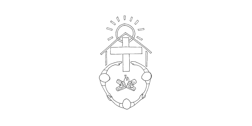 The concept is the sun for outdoor emphasis, the cabin, and campfire for the setting. The trinity is present in several ways, sun for Father, cross for Son, and dove/flame for Holy Spirit, also in three flames (a connection to the PCUSA logo) and three humans. The three people are connected, their space is filled by the Holy Spirit, and they point to the cross. They form a circle, yet have an open spot to accept others into the circle to join them.